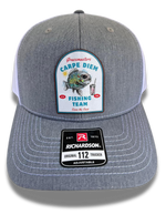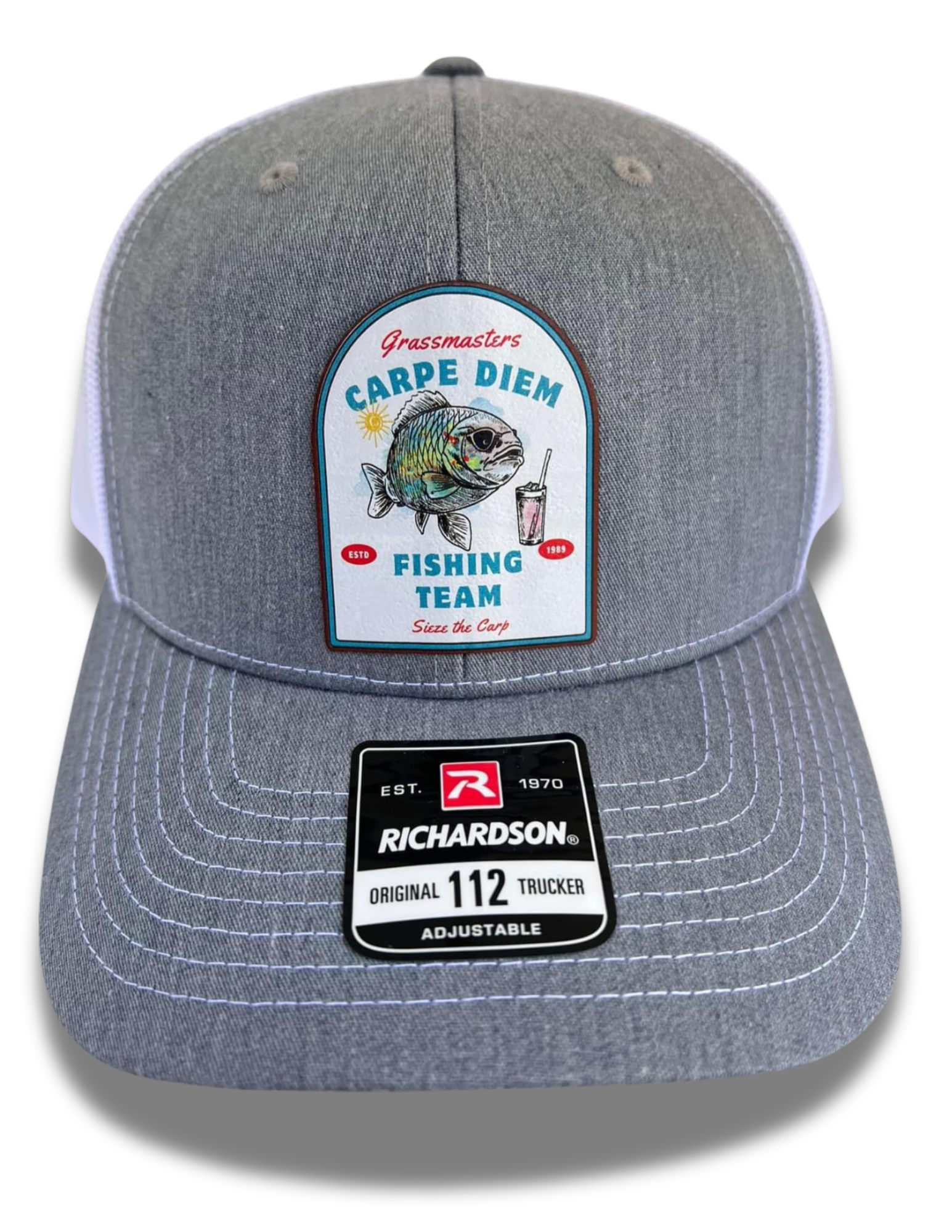 Carpe Diem Fishing Team Hat β Seize the day (or the fish) with this heather gray hat with white mesh, featuring a bold and colorful carp design for the "Carpe Diem Fishing Team". Adjustable snapback closure. π£π
