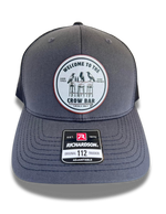 The Crow Bar Trucker Hat β Inspired by good times and good friends, this charcoal hat with black mesh features three crows perched at a bar, advertising "The Crow Bar." Cheers to witty wordplay! Adjustable snapback closure.π»π¦