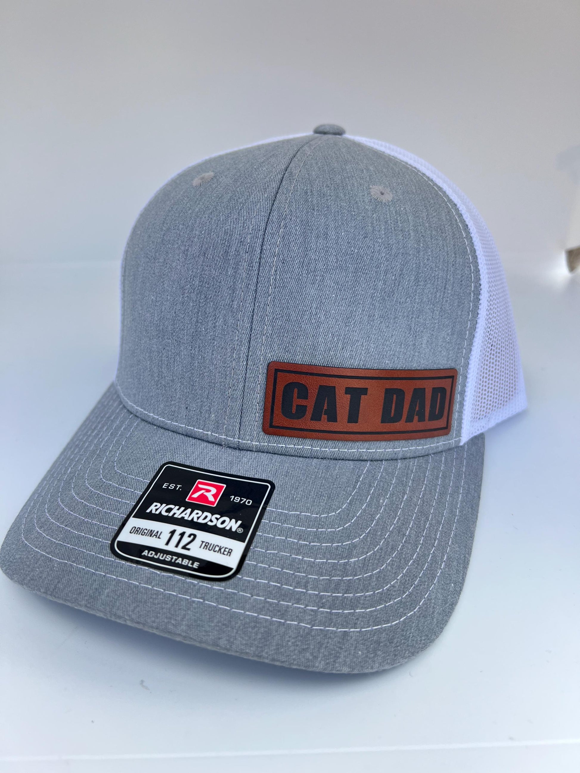 - Richardson 112 hat adorned with a leather patch reading "Cat Dad"