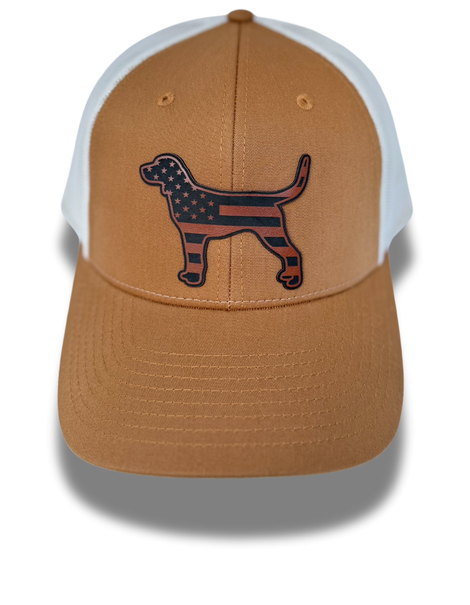 Patriotic Pup Trucker Hat – Show off your love for dogs and country with this caramel Richardson snapback featuring birch mesh for breathability. This hat  showcases a detailed dog silhouette with an American flag print, blending rugged style with patriotic pride. Perfect for everyday wear, outdoor adventures, and dog lovers alike. Adjustable fit. 🇺🇸🐶