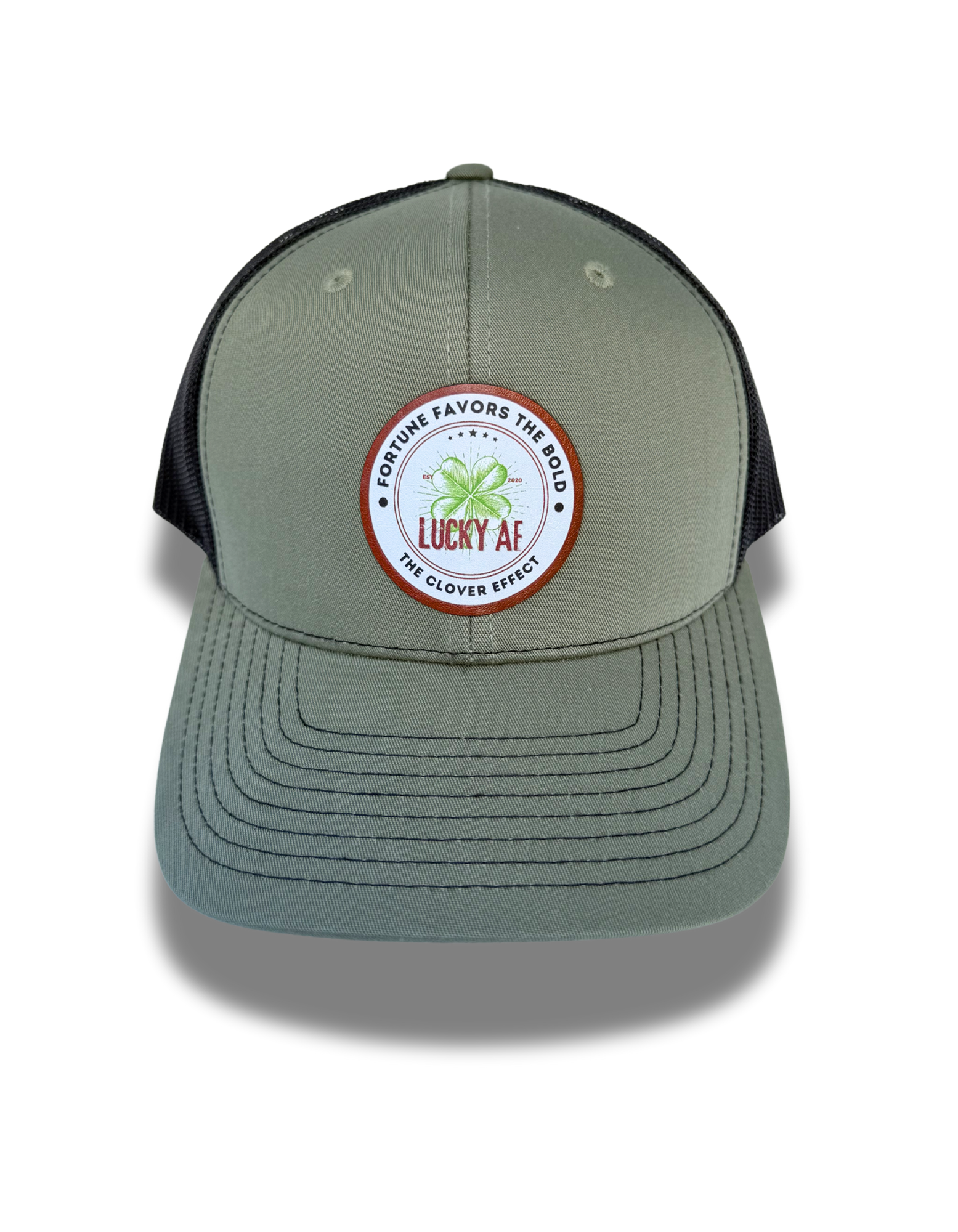 Lucky AF Trucker Hat โ Luck is on your side with this loden green snapback with black mesh, featuring a Colorwave patch that boldly states "Lucky AF." A fun, bold way to show off your good fortune and great style. Adjustable snapback closure. ๐๐ฅ