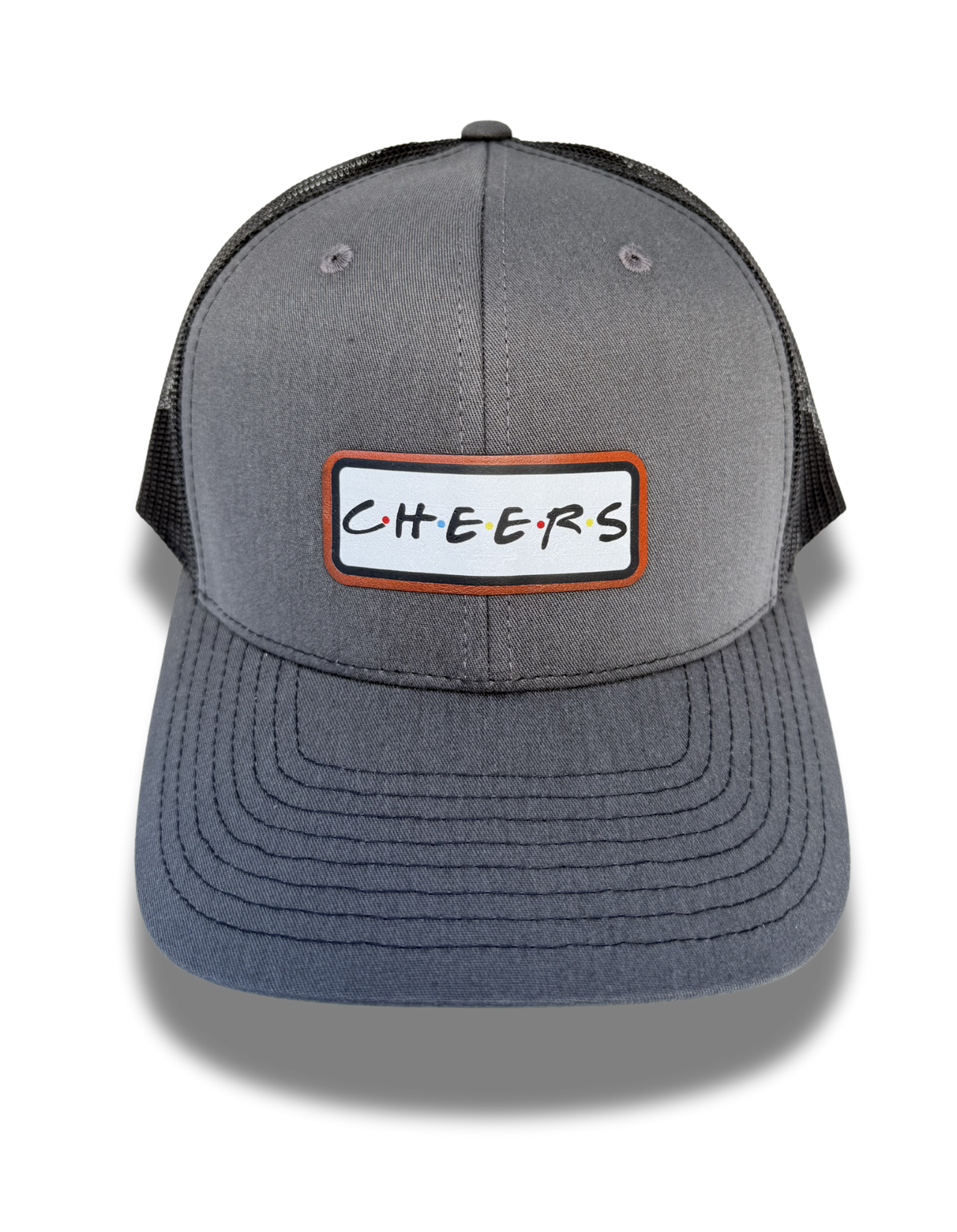 Cheers Trucker Hat โ Celebrate good times with this charcoal snapback with black mesh, featuring a Colorwave patch of the word "Cheers" in the iconic Friends TV show font. A must-have for sitcom fans and social butterflies. Adjustable snapback closure. ๐ป๐ฌ