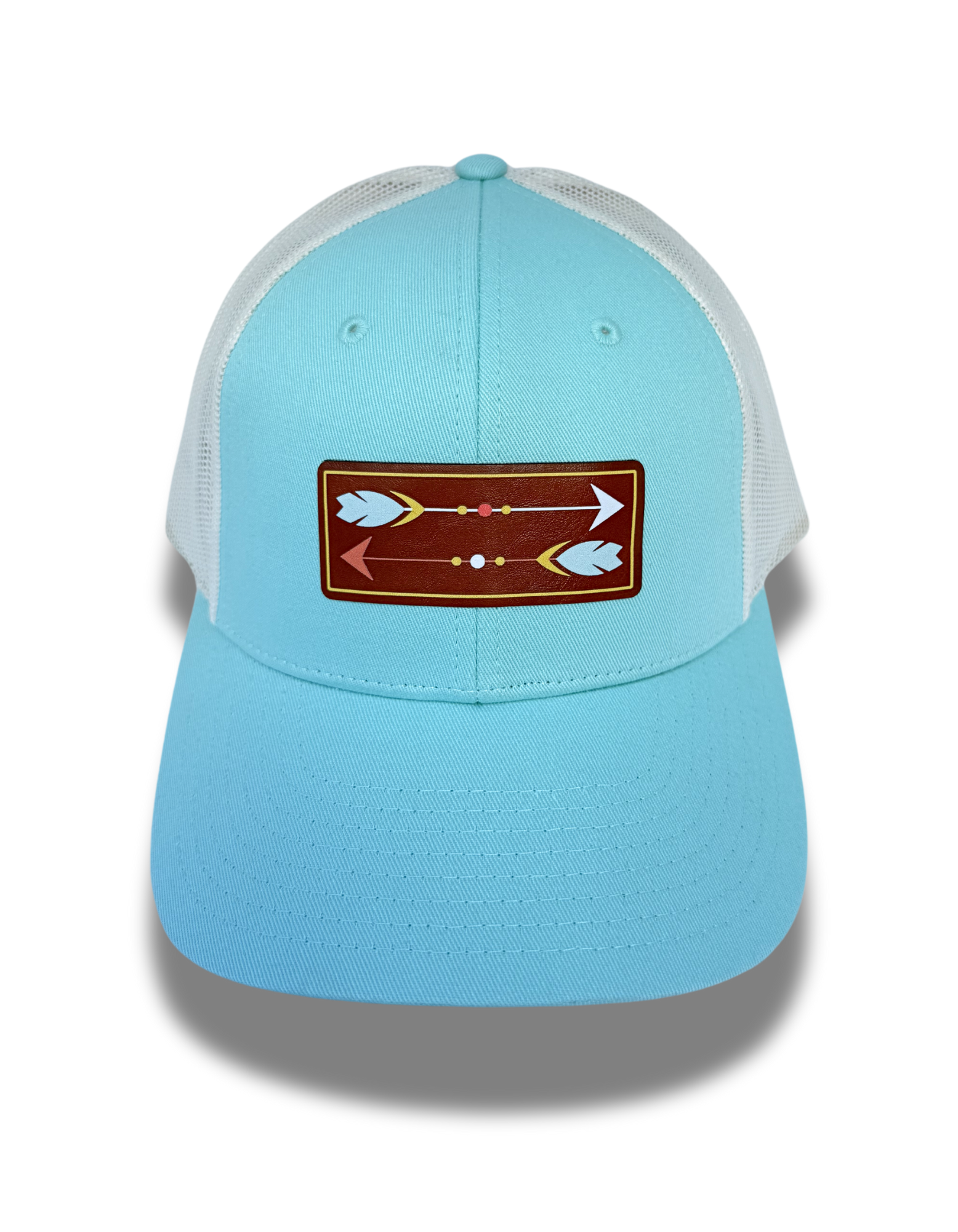 Feather Arrows Trucker Hat β Stand out with this Aruba blue snapback with birch mesh, featuring a Colorwave patchwith two vibrant arrows pointing in opposite directionsβa symbol of movement, balance, and adventure. Adjustable snapback closure. πΉπ