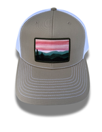 Blue Ridge Sunset Trucker Hat β Capture the beauty of the Blue Ridge Mountains with this khaki snapback with white mesh, featuring a print stitch patch of a local artistβs acrylic painting of a breathtaking sunset over the mountains. Adjustable snapback closure. π