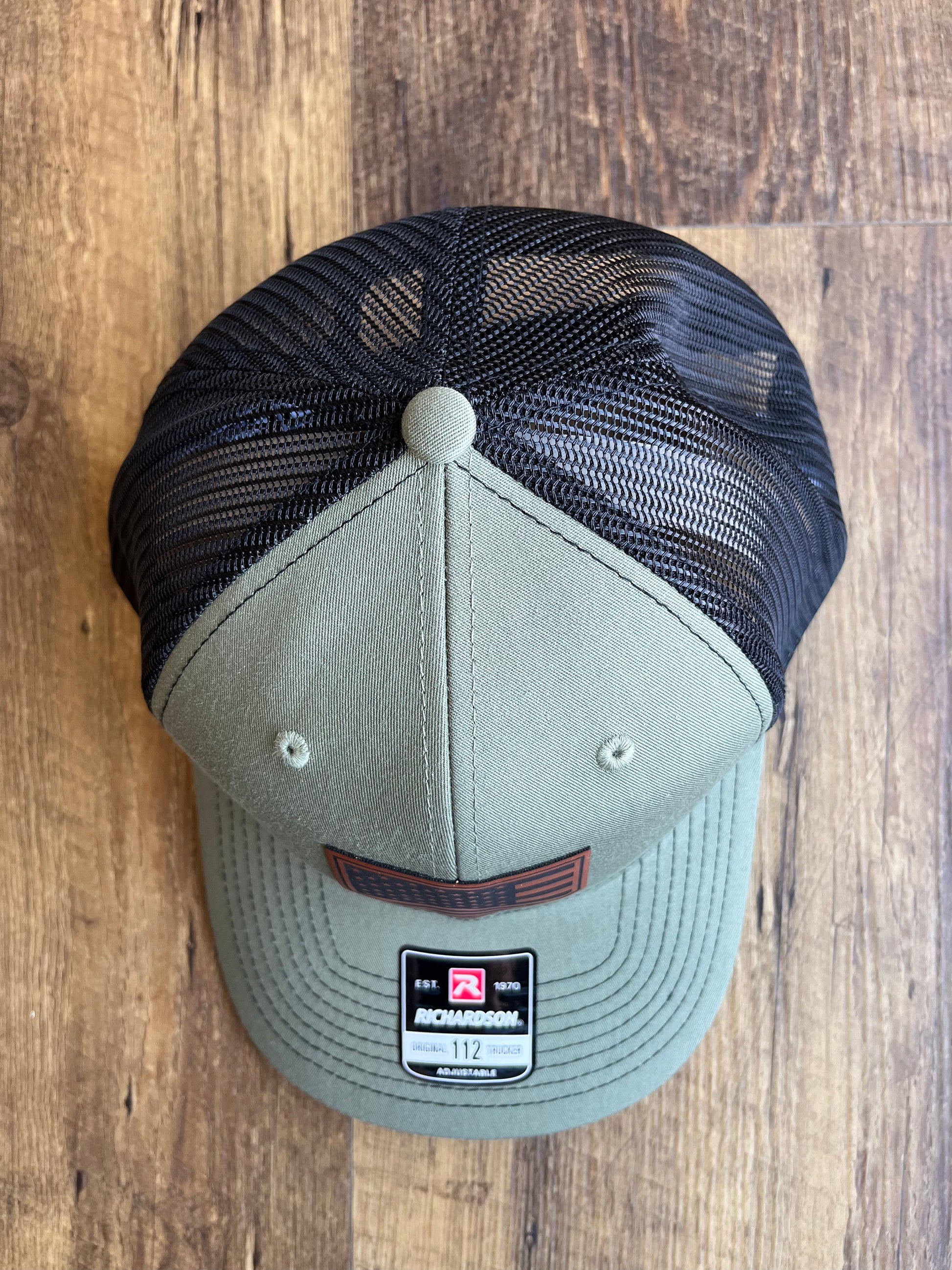 - Richardson 112 hat adorned with a leather patch depicting a baseball diamond with the American flag